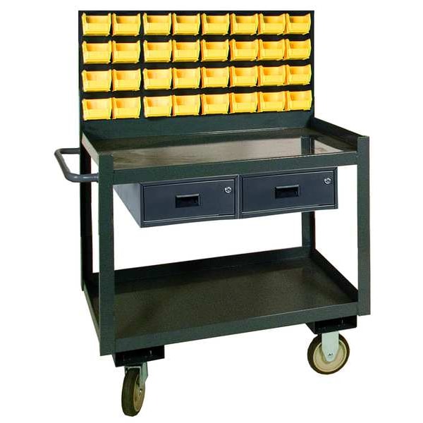 Mobile Workstation, Assembled/Unassembled Assembled, Bin Outside Height 3 in, Bin Outside Length 7 in, Bin Outside Width 4 in, Bottom Shelf Lip Height 1 1/2 in, Caster Brake Type Side Pedal Brake, Caster Mounting Type Plate, Caster Wheel Dia. 5 in, Caster Wheel Type Standard, Caster Wheel/Tread Material Polyurethane, Caster/Wheel Configuration (2) Rigid, (2) Swivel with Brake, Caster/Wheel Mounting Location Standard, Color Gray
