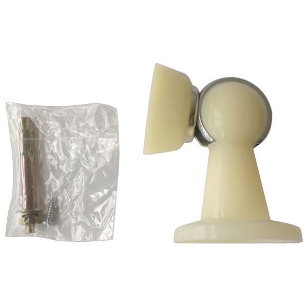 Magnetic Door Holder, Plastic Finish, Material Plastic, Color Ivory, Holder Base Height 1 7/8 in, Holder Base Width 1 7/8 in, Holder Projection 7/8 in, Strike Base Height 2 3/16 in, Strike Base Width 2 3/16 in, Strike Projection 3 in, Base Dia. 1 3/4 in, Magnetic Strength 15.4 lb, Mounting Type Screw In, Hardware Included