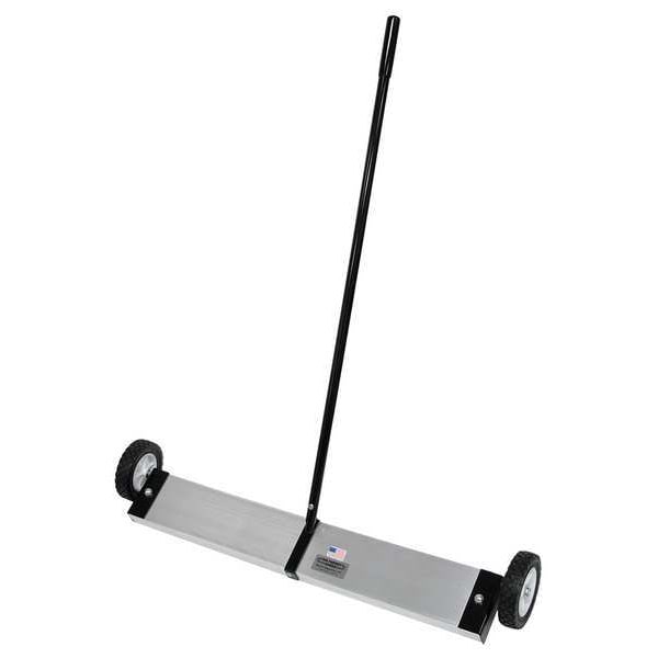 Magnetic Floor Sweeper, Ground Clearance - Maximum 1 in, Handle Material Steel, Includes (2) Mounting Eye Bolts, Magnet Depth 7 1/2 in, Magnet Height 1 3/4 in, Magnet Length 36 in, Magnetic Pull Capacity - Maximum 240 lb, Magnetic Release Type Lever, Overall Height 43 1/2 in, Wheel Diameter 6 in, Wheel Material Rubber, Features Indoor and Outdoor Use, Permanent Magnetism, Housing Material Aluminum, Mounting Type Forklift, Product Type Magnetic Floor Sweeper
