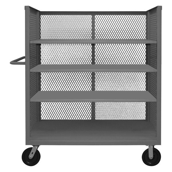 Single-Side-Access Mesh-Wall Metal Stock Truck, Load Capacity 3,000 lb, Number of Shelves 4, Shelf Length 60 in, Shelf Width 24 in, Caster Brake Type No Brake Included, Caster Wheel Dia. 6 in, Caster Wheel/Tread Material Phenolic, Caster/Wheel Configuration (2) Rigid, (2) Swivel, Caster/Wheel Mounting Location Standard, Distance Between Shelves 13 in, Finish Powder Coated, Handle Type Flat, Material Steel, Method of Construction Welded, Overall Length 24 1/2 in, Overall Width 66 1/2 in