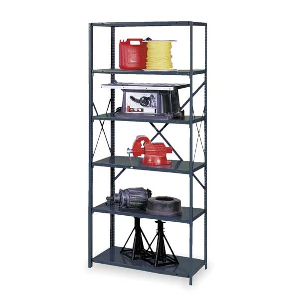 Metal Shelving, Gray, Powder Coated, Frame Material Steel, Load Capacity per Shelf 750 lb, Whole Unit Load Capacity 3,750 lb, Number of Shelves 5, Overall Depth 24 in, Overall Height 84 in, Overall Width 36 in, Shelf Configuration Starter, Shelf Style Solid, Shelving Material Steel, Assembled Unassembled, Shelving Gauge 22 ga, Post Gauge 22 ga, Shelf Adjustment Increments 1 1/2 in, Number of Drawers 0, Duty Rating Medium-Duty