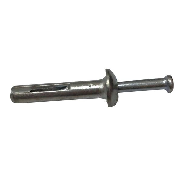 Hammer Drive Pin Anchor Set, Anchor Diameter 3/16 in, Overall Length 7/8 in, Thread Size Not Applicable, Thread Length Not Applicable, Anchor Material Zamac Alloy, Pin Material Steel, Finish Zinc Plated, Head Type Mushroom, Drill Bit Size 1/4 in, Minimum Installation Depth 5/8 in, Maximum Material Thickness 1/4 in, Ultimate Tension Strength (4,000 psi Concrete) 640 lb, Pin-Drive Anchor Type Metal Removable Nail Drive Anchor, System of Measurement Inch