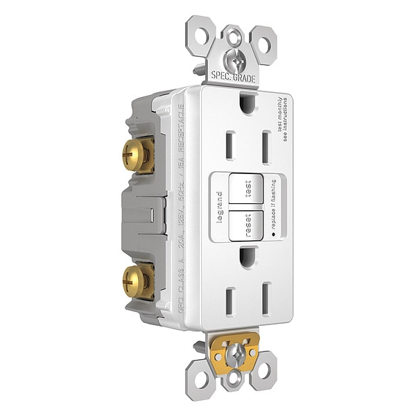 Power Inlet, Connection Orientation Straight, Cover Type No Cover, Current Rating 15 A, GFCI Yes, Grounding Grounded, Hazardous Location Specification Not Applicable, Housing Color White, Housing Material Plastic, Mount Type Flush, NEMA Enclosure Rating 5, NEMA Receptacle Configuration 5-15R, Number of Gangs 1, Number of Poles 2, Number of Wires 3, Phase Single, Polarized No, Receptacle Type Duplex, Resistance Properties Impact Resistant, Tamper Resistant, Standards cULus Listed, FSUL, UL Listed