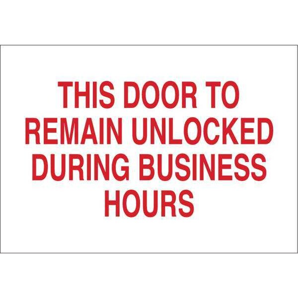 No Header, This Door To Remain Unlocked During Business Hours, 10 in W x 7 in H, Plastic
