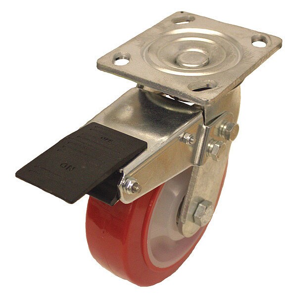 Swivel, Plate Caster, Load Rating 770 lb, Swivel Lock Type Total Lock, Wheel Dia. 6 in, Wheel Width 2 in, Wheel/Tread Material Polyurethane, Wheel Core Material Polyolefin, Non-Marking Yes, Number of Wheels 1, Caster Brake Type Total Lock, Tread Shape Standard