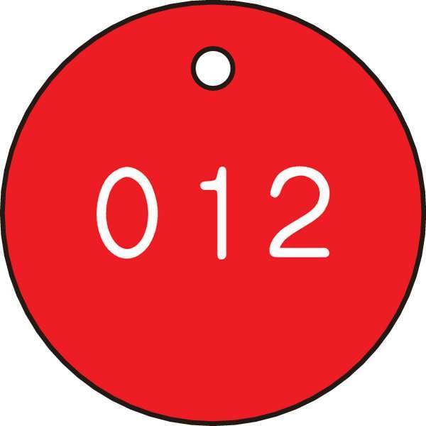 Numbered Tag, Plastic, 1 1/4 in H x 1 1/4 in W, 1 1/4 in Dia., Red/White, Round, 100 PK