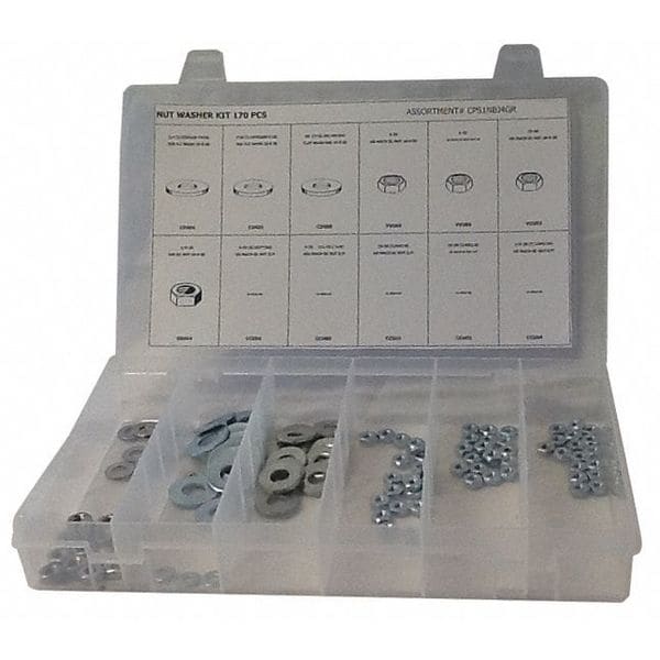 Nut and Washer Assortment, Dimensional Standards ASME B18.2.2, ASME B18.21.1, Hex Type Hex Assortment, Includes Washers Yes, Number of Nuts 90, Number of Thread Sizes 7, Number of Washers 80, Nut Finish Plain, Nut Material Stainless Steel, Nut Type Hex Nut, Standards ASME B18.2.2, ASME B18.21.1, System of Measurement Inch, Thread Sizes #10-24, #6-32, #8-32, 1/4 In.-20