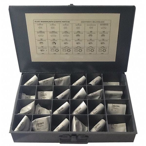 Hex Nuts (50) Each: 6-32, 8-32, 10-24, 10-32, 1/4"-20, SAE Flat Washers #6, #8, #10, USS Flat Washer 1/4 in, (25) Each: LKNT NY 6-32, 8-32, 10-24, 10-32, 1/4"-20, Split Lock Washers #6, #8, #10, #12, 1/4 in, Finishing Cup Washers #6, #8, #10, #12, #14, Metal Compartment Box with Lid