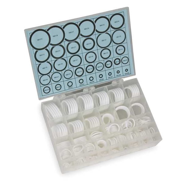 O-Ring Set, SAE, Material PTFE, Number of Pieces 325, Number of Sizes 36, Durometer 55D, Hardness Very Hard, Sizes Included (10) Each of 013, 014, 015, 016, 017, 018, (10) Each of 110, 111, 112, 113, 114, 115, 116, (15) Each of 005, 006, 007, 008, 009, 010, 011, 012, (5) Each of 117, 118, 119, 120, 121, (5) Each of 210, 211, 212, 213, 214, 215, 216, 217, 218, 219, Case Type Plastic Box with Lid Chart, Meets/Exceeds AS568, Temp. Range -100 Degrees to 500 Degrees F, Color White
