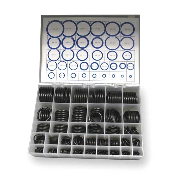 O-Ring Set, SAE, Material Buna-N, Number of Pieces 436, Number of Sizes 36, Durometer 70A, Hardness Medium Hard, Sizes Included (10) Each of 013 to 018, 111 to 116, 210, 211, (15) Each of 012, 110, (25) Each of 005 to 011, (7) Each of 117 to 121, 212 to 219, Case Type Plastic Box with Lid Chart, Meets/Exceeds ASTM D2000, SAE J200, Temp. Range -40 Degrees to 250 Degrees F, Color Black