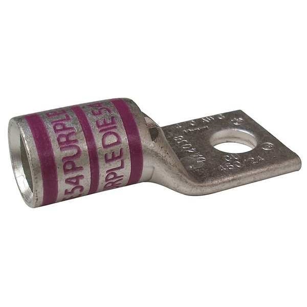 One-Hole Lug Compression Connector, Barrel Size Short, Color Code Purple, Die Code 54, Tongue Angle Straight, Tongue Width 1.03 in, For Conductor Material Copper, For Stud Size 5/16 in, For Stranded Copper Wire Size - Minimum 4/0 AWG, For Stranded Copper Wire Size - Maximum 4/0 AWG, Inspection Hole Yes, Material Copper, Maximum Operating Temperature 300 Degrees F, Maximum Voltage 600 V AC, Termination Style Crimp, Seam Style Seamless, Standards CSA Certified, UL Listed, Number of Holes 1