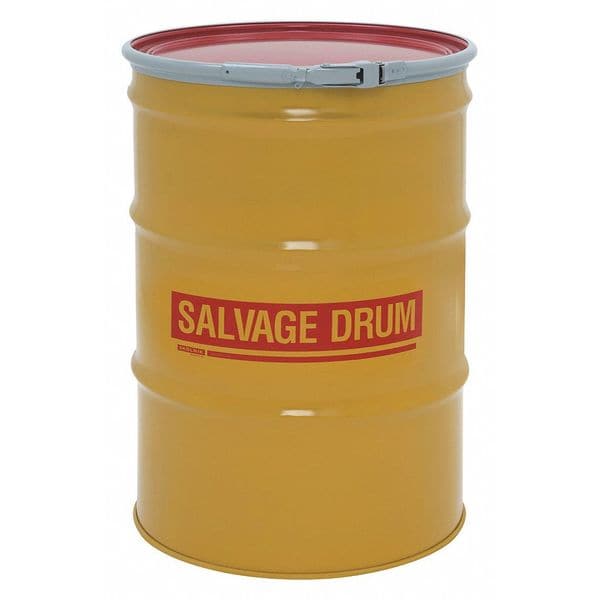 Salvage Drum, Body Color Yellow, Body Material Gauge 18 ga, Body Thickness 1.2 mm, Bottom Material Gauge 18 ga, Closing Ring Material Steel, Cover Color Red, Cover Material Carbon Steel, Drum Closure Lever Lock Ring, Drum Head Type Open Head, Interior Lining Unlined with Rust Inhibitor, Number of Bung Holes 0, Overall Height 34 1/2 in, Top Material Gauge 16 ga, Top Outside Diameter 23 in, UN Rating Liquids Not Rated, UN Rating Solids 1A2/X400/S, Volume Capacity 55 gal