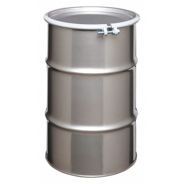 Transport Drum, Body Color Gray, Body Material Gauge 18 ga, Body Thickness 1.2 mm, Bottom Material Gauge 18 ga, Closing Ring Material Steel, Cover Color Gray, Cover Material 304 Stainless Steel, Drum Closure Bolt Ring, Drum Head Type Open Head, Interior Lining Unlined/No Interior Coating, Number of Bung Holes 0, Overall Height 29 in, Top Material Gauge 16 ga, Top Outside Diameter 18 3/4 in, UN Rating Liquids 1A2/Y1.5/150, UN Rating Solids 1A2/X225/S, Volume Capacity 30 gal