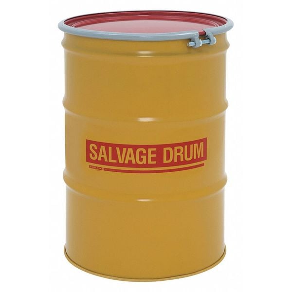 Salvage Drum, Body Color Yellow, Body Material Gauge 18 ga, Body Thickness 1.2 mm, Bottom Material Gauge 18 ga, Closing Ring Material Steel, Cover Color Red, Cover Material Carbon Steel, Drum Closure Bolt Ring, Drum Head Type Open Head, Interior Lining Unlined with Rust Inhibitor, Number of Bung Holes 0, Overall Height 34 1/2 in, Top Material Gauge 16 ga, Top Outside Diameter 23 in, UN Rating Liquids 1A2/Y1.5/150, UN Rating Solids 1A2/X400/S, Volume Capacity 55 gal