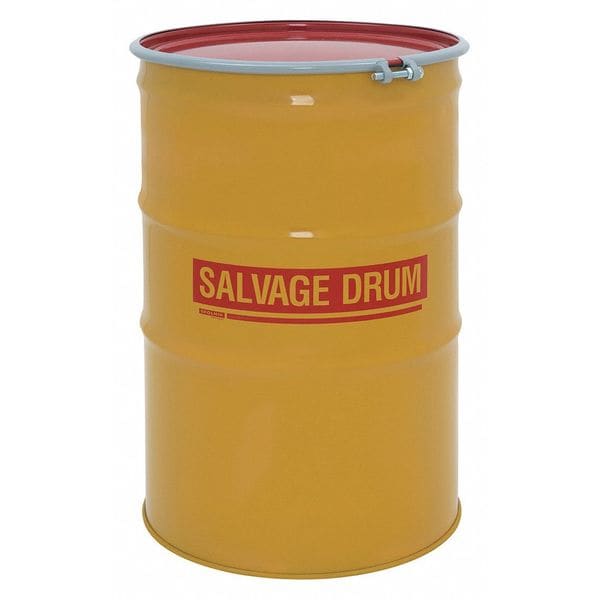 Salvage Drum, Body Color Black/Yellow, Body Material Gauge 16 ga, Body Thickness 1.5 mm, Bottom Material Gauge 16 ga, Closing Ring Material Steel, Cover Color Red, Cover Material Carbon Steel, Drum Closure Bolt Ring, Drum Head Type Open Head, Interior Lining Unlined with Rust Inhibitor, Number of Bung Holes 0, Overall Height 42 3/4 in, Top Material Gauge 16 ga, Top Outside Diameter 27 in, UN Rating Liquids Not Rated, UN Rating Solids 1A2/X440/S, Volume Capacity 96 gal