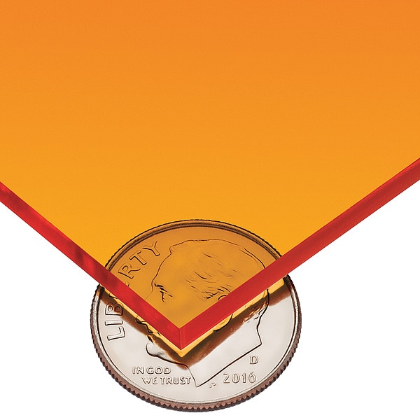 Acrylic Sheet, Acrylic, Grade Standard, Plastic Length 8 ft, Plastic Width 4 ft, Plastic Thickness 0.25 in, Orange, Plastic Clarity Clear, Tensile Strength 9,000 psi, Impact Strength 0.3 ft-lb/in, Friction Coefficient 0.8, Water Absorption 0.4 Percent, Temperature Range 40 Degrees to 190 Degrees F, Plastic Density 0.043 lb/cu in, Plastic Hardness Rockwell M95