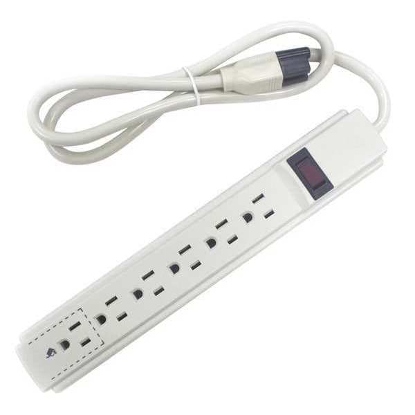 Outlet Strip, Application Home and Office, Housing Material Plastic, Total Number of Outlets 6, Max. Amps 15 A, Cord Length 3 ft, Number of Power Switches 1, Power Indicator No, Number of Outlet Rows 1, Receptacle Configuration NEMA 5-15R, Plug Configuration NEMA 5-15P, Wire Size 14 AWG, Mounting Style Keyhole, Color Beige, Medical Facility Use Not Allowed, Number of Transformer Outlets 1, Number of Conductors 3, Voltage 125V AC, Outlet Center Distance 1 1/8 in, Length 11 in