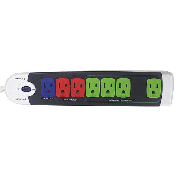 Surge Protector Outlet Strip, Total Number of Outlets 7, Color White, Cord Length 4 ft, Communication Port None, Rated Joules 1,050, Application Home and Office, Housing Material Plastic, Max. Amps 15 A, Power Indicator Yes, Receptacle Configuration NEMA 5-15R, Plug Configuration NEMA 5-15P, Wire Size 14 AWG, Number of Transformer Outlets 1, USB Charging Port 0, Medical Facility Use Not Allowed, Number of Conductors 3, Voltage 125V AC, Length 13 in