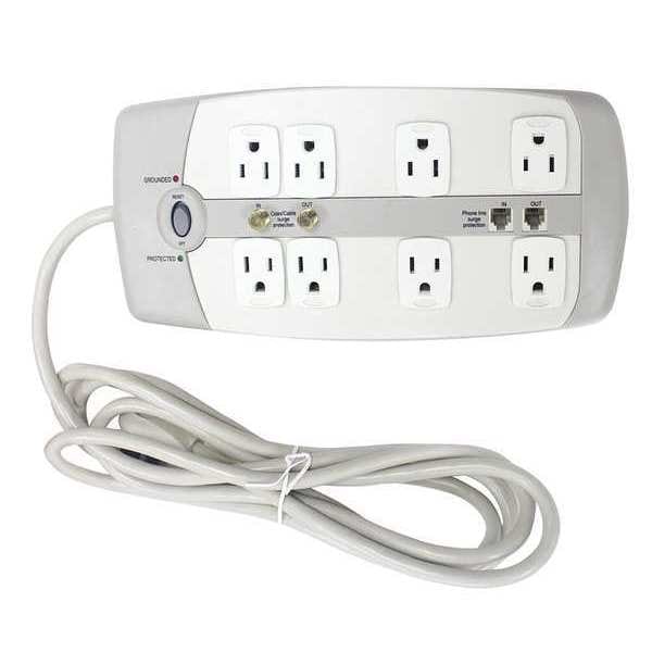 Surge Protector Outlet Strip, Total Number of Outlets 8, Color White, Cord Length 10 ft, Communication Port (2) Coaxial, (2) RJ11 Telephone, Rated Joules 1,050, Application Home and Office, Housing Material Plastic, Max. Amps 15 A, Power Indicator Yes, Receptacle Configuration NEMA 5-15R, Plug Configuration NEMA 5-15P, Wire Size 14 AWG, Number of Transformer Outlets 4, USB Charging Port 0, Medical Facility Use Not Allowed, Number of Conductors 3, Voltage 125V AC, Length 10 1/2 in