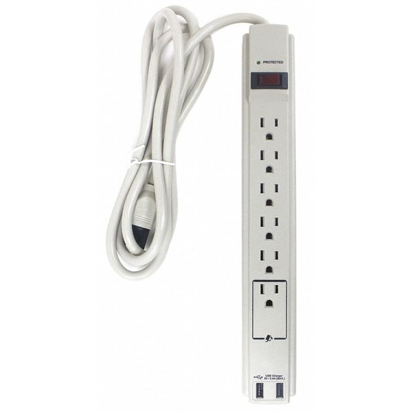 Surge Protector Outlet Strip, Total Number of Outlets 6, Color White, Cord Length 6 ft, Communication Port None, Rated Joules 1,050, Application Home and Office, Housing Material Plastic, Max. Amps 15 A, Power Indicator Yes, Receptacle Configuration NEMA 5-15R, Plug Configuration NEMA 5-15P, Wire Size 14 AWG, Number of Transformer Outlets 1, USB Charging Port 2, Medical Facility Use Not Allowed, Number of Conductors 3, Voltage 125V AC, Length 13 in