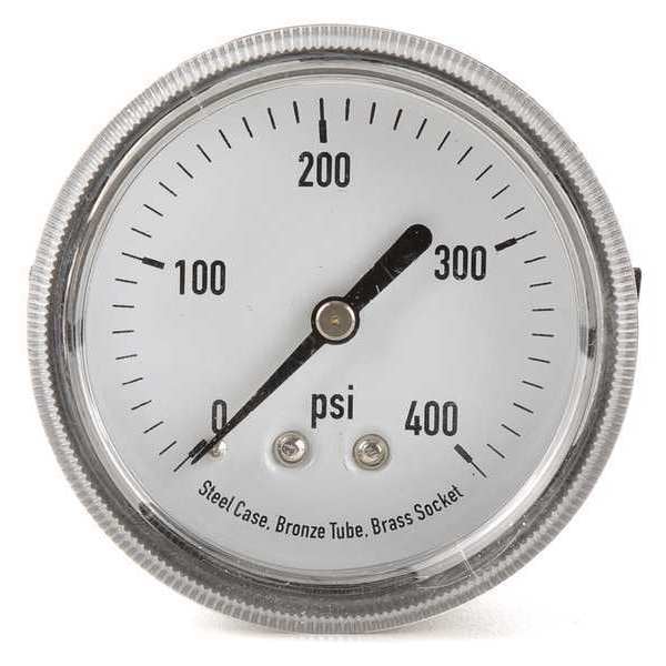 Panel-Mount Pressure Gauge, Nominal Dial Size 2 1/2 in, Accuracy +/-3-2-3 Percent, Gauge Case Material Steel, Process Connection Type NPT, Process Connection Gender Male, Lens Material Polycarbonate, Process Connection Size 1/8 in, Field Fillable No, Process Connection Location Center Back, Case Color Black, IP/NEMA Rating Not Rated, Primary Pressure Range 0 to 400, Dry Dampening Feature None, Vibration Resistance None, Dial Color White, Pressure Gauge Type Commercial Pressure Gauge