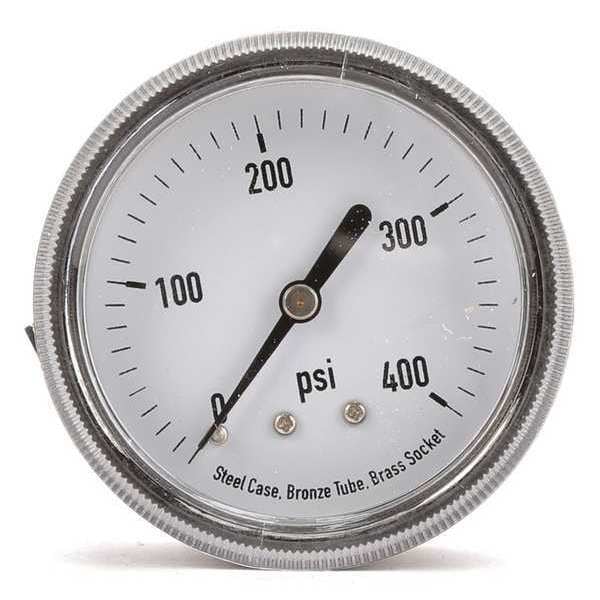 Panel-Mount Pressure Gauge, Nominal Dial Size 2 1/2 in, Accuracy +/-3-2-3 Percent, Gauge Case Material Steel, Process Connection Type NPT, Process Connection Gender Male, Lens Material Polycarbonate, Process Connection Size 1/4 in, Field Fillable No, Process Connection Location Center Back, Case Color Black, IP/NEMA Rating Not Rated, Primary Pressure Range 0 to 400, Dry Dampening Feature None, Vibration Resistance None, Dial Color White, Pressure Gauge Type Commercial Pressure Gauge