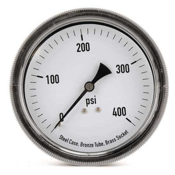 Panel-Mount Pressure Gauge, Nominal Dial Size 3 1/2 in, Accuracy +/-3-2-3 Percent, Gauge Case Material Steel, Process Connection Type NPT, Process Connection Gender Male, Lens Material Polycarbonate, Process Connection Size 1/4 in, Field Fillable No, Process Connection Location Center Back, Case Color Black, IP/NEMA Rating Not Rated, Primary Pressure Range 0 to 400, Dry Dampening Feature None, Vibration Resistance None, Dial Color White, Pressure Gauge Type Commercial Pressure Gauge