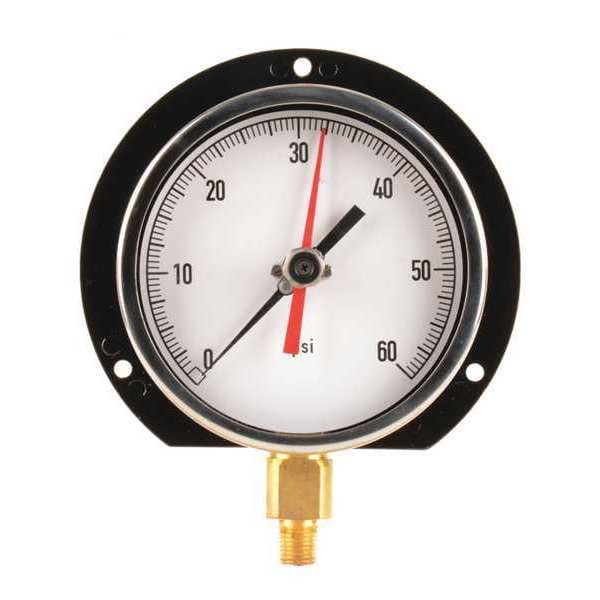 Panel-Mount Pressure Gauge, Nominal Dial Size 4 1/2 in, Accuracy +/-0.5 Percent, Gauge Case Material Cast Aluminum, Process Connection Type NPT, Process Connection Gender Male, Lens Material Polycarbonate, Process Connection Size 1/4 in, Field Fillable No, Process Connection Location Bottom, Case Color Black, IP/NEMA Rating Not Rated, Primary Pressure Range 0 to 60, Dry Dampening Feature None, Vibration Resistance None, Dial Color White, Pressure Gauge Type Process Pressure Gauge