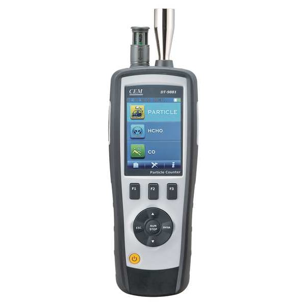 Particle Counter, Calibration Certificate Type Not Certified, Number of Channels 6, Number of Records Stored 5,000, Particle Size 0.3 um, 0.5 um, 1 um, 2.5 um, 5 um, 10 um, Count Modes Concentration, Cumulative, Differential, Maximum Relative Humidity Measured 100 Percent, Maximum Sampling Rate 60 sec, Maximum Temperature Measured 122 Degrees F, Minimum Relative Humidity Measured 0 Percent, Minimum Sampling Rate 0 sec, Minimum Temperature Measured 32 Degrees F, Flow Rate 0.1 cfm