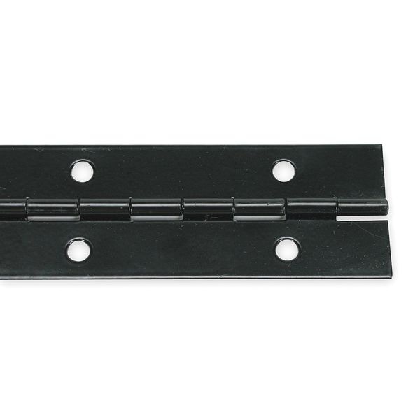 Piano Hinge, Ligature Resistant No, Steel Material, 180 Degrees Range of Motion, Black Finish, With Holes, Non Handed Orientation, 1/2 in Overall Knuckle Height, 48 in Door Leaf Height, 48 in Frame Leaf Height, 3/4 in Door Leaf Width, 3/4 in Frame Leaf Width, 0.04 in Door Leaf Thickness, 0.04 in Frame Leaf Thickness, Length 4 ft, Not Included Hardware, 2 in Hole Spacing, 24 Holes per Leaf, Full Surface Mounting, 3/32 in Pin Dia., Steel Pin Material, Nonremovable Pin Type, 1 1/2 in Overall Width