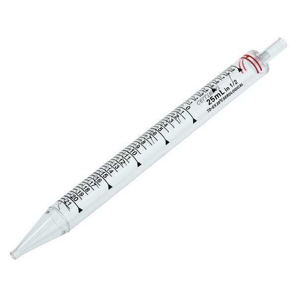 Serological Pipette, Short, Capacity 25 mL, Graduation Range 3.5 to 25mL, Material of Construction Plastic, Graduation Subdivisions 0.5 mL, Negative Graduations -10 mL, Tolerance 2 Percent, Length 23.5 cm, Band Color Red, Class A, Sterile, Standards ASTM E-934, Package Quantity 100
