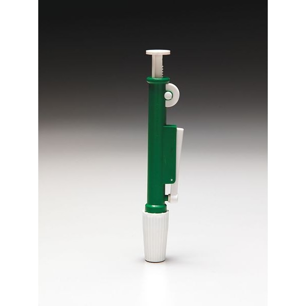 Designed for easy and precise pipetting. Pumps feature a lever for quick release, and forward or backward wheel movement. The soft elastic chuck has a threaded collar to tightly grip glass or plastic pipettes. Easy to clean. 10 mL Capacity, Green.