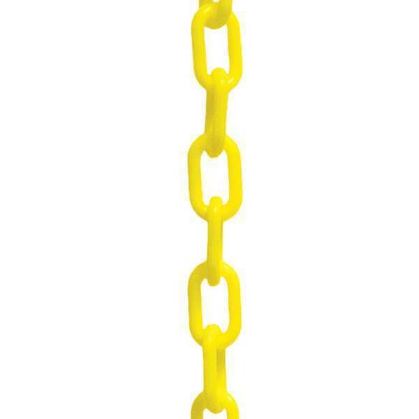 Plastic Chain, Length 50 ft, Color Yellow, Material Plastic, Finish Gloss, Link Outside Length 2.1 in, Link Outside Width 1.3 in, Link Inside Length 1.4 in, Link Inside Width 0.6 in, Reflectivity Non-Reflective, Indoor/Outdoor Usage Indoor, Outdoor, For Use With 99902-4 3 in Heavy Duty Stanchion, Resistance Properties UV Resistant