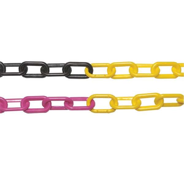 Plastic Chain, Length 100 ft, Color Black/Yellow, Material Polyethylene, Finish Gloss, Link Outside Length 1.9 in, Link Outside Width 1.1 in, Link Inside Length 1.3 in, Link Inside Width 0.5 in, Reflectivity Non-Reflective, Link Thickness 0.2 in, Indoor/Outdoor Usage Indoor, Outdoor, For Use With Chain Stanchions, Cone Connectors, Poles, Weight 7 lb, Resistance Properties Rust Resistant, UV Resistant, Standards WBENC Certified, Manufacturer Warranty Length 5 yr