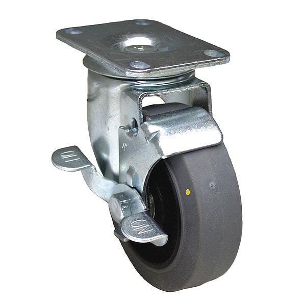 Swivel, Plate Caster, Load Rating 200 lb, Swivel Lock Type No Lock Included, Wheel Dia. 3 in, Wheel Width 1 1/4 in, Wheel/Tread Material Rubber, Wheel Core Material Polyolefin, Non-Marking Yes, Number of Wheels 1, Caster Brake Type Side Brake, Tread Shape Standard