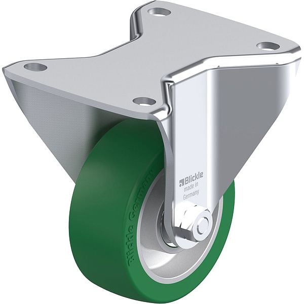 Rigid, Plate Caster, Wheel Dia. 102 mm, Wheel Width 40 mm, Wheel/Tread Material Polyurethane, Wheel Core Material Aluminum, Non-Marking Yes, Number of Wheels 1, Caster Brake Type No Brake, Tread Shape Standard