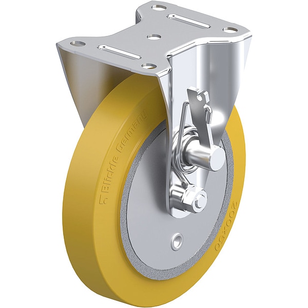 Rigid, Plate Caster, Wheel Dia. 8 in, Wheel Width 2 in, Wheel/Tread Material Polyurethane, Wheel Core Material Iron, Non-Marking Yes, Number of Wheels 1, Caster Brake Type Safety Brake, Tread Shape Standard