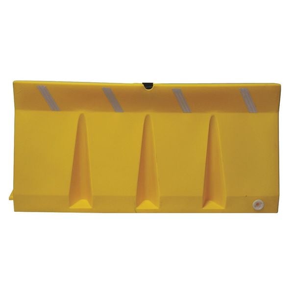 Polycade Traffic Barrier, Legend Striped/Blank, Accepts Light Yes, Style Jersey Barrier, Empty Weight 55 lb, Fillable Ballast Material Sand, Water, Interlocking Yes, Body Material Plastic, Overall Depth 18 1/2 in, Fillable Yes, Overall Height 33 3/4 in, Barricade Width 69 3/4 in, Color Yellow, Weight When Filled with Water 1,336 lb, Reflective Grade Diamond, Standards OSHA, Type Unrated, Series TB-6