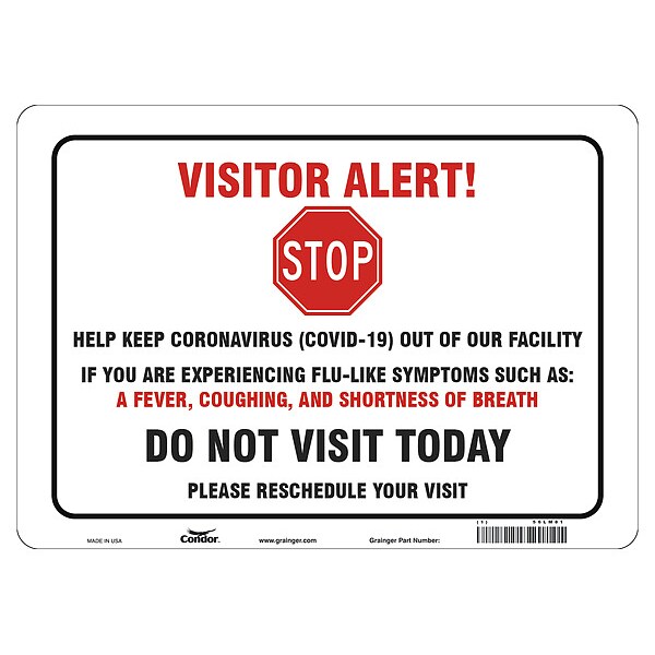 Covid 19 Sign 10X14, Visitor Alert Cv19,, Sign Subject Matter Coronavirus Prevention, Height 10 in, Width 14 in, Sign Material Polystyrene, Sign Mounting Style With Mounting Holes, Header No Header, Legend Visitor Alert Stop Help Keep Coronavirus (Covid-19) Out Of Our Facility If You Are Experiencing Flu Like Symptoms Do Not Visit Today, Printed Language English