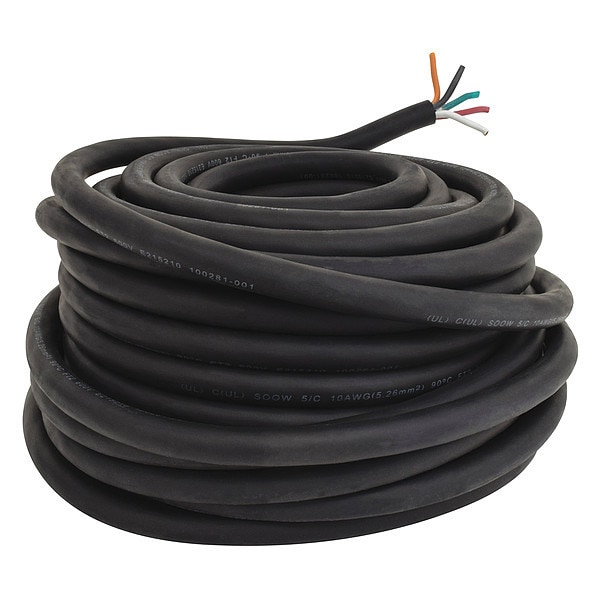 Portable Cord, SOOW, 10 AWG, 5 C, Black, Rubber, Stranded, 600V, Indoor/Outdoor, 100 ft