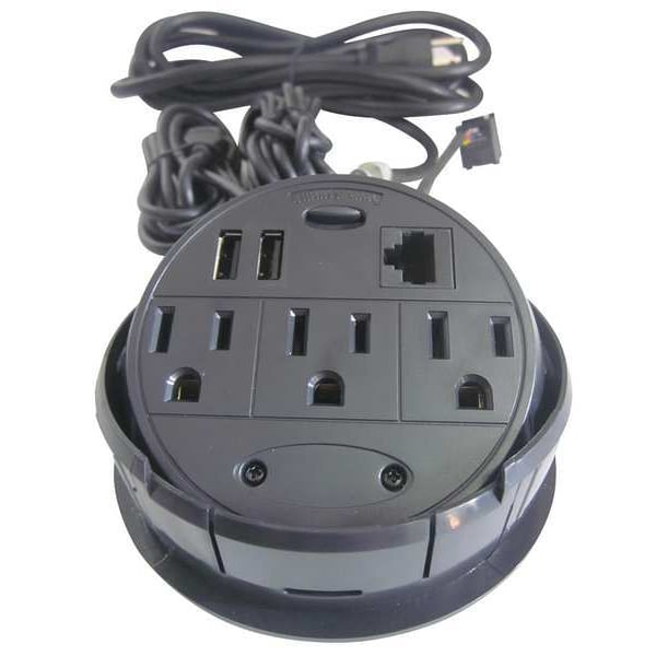 Power Pod, Current Rating 12 A, Housing Color Black, Housing Material Plastic, Includes RJ45 Jack, Mount Type Recessed, Number of Outlets 3, Number of USB Ports 2, Overall Height 2.5 in, Overall Width 4.22 in, Plug Style Straight, Power Cord Length 8 ft, Shape Round, Standards cULus 962A,E309585, USB Connectors Included Type A, Voltage Rating 125V AC, Wire Size 14 AWG