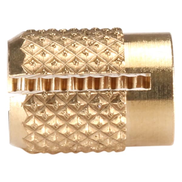 Press Insert, Insert Type Knurled Press Insert, System of Measurement Inch, Overall Length 1/4 in, Insert Diameter 13/64 in, Thread Size #6-32, Thread Direction Right Hand, Thread Type Coarse, Material Brass, Material Grade/Class C3604, Finish Plain, Flange Style Flush, Body Texture Knurled, Number of Fins Not Applicable, Compatible Material Plastic, Drill Bit Size 3/16 in, Minimum Material Thickness 5/16 in, Maximum Hole Diameter 0.188 in, Manufacturer Location Globally Sourced