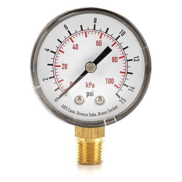 Commercial Pressure Gauge, Nominal Dial Size 2 in, Accuracy +/-3-2-3 Percent, Gauge Case Material ABS Plastic, Process Connection Type NPT, Process Connection Gender Male, Lens Material Acrylic, Process Connection Size 1/4 in, Field Fillable No, Process Connection Location Bottom, Case Color Black, IP/NEMA Rating Not Rated, Primary Pressure Range 0 to 15, Dry Dampening Feature None, Vibration Resistance None, Dial Color White, Pressure Gauge Type Commercial Pressure Gauge, Liquid-Filled Case No