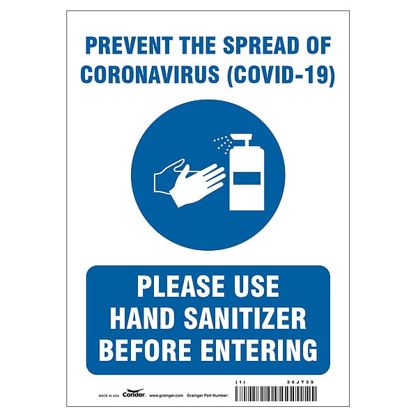 Prevent The Spread Of Coronavirus Sign, Sign Subject Matter Coronavirus Prevention, Height 14 in, Width 10 in, Sign Material Polystyrene, Sign Mounting Style With Mounting Holes, Header No Header, Legend Prevent the Spread Of Coronavirus (COVID-19) Please Use Hand Sanitizer Before Entering, Printed Language English, Sign Shape Rectangle