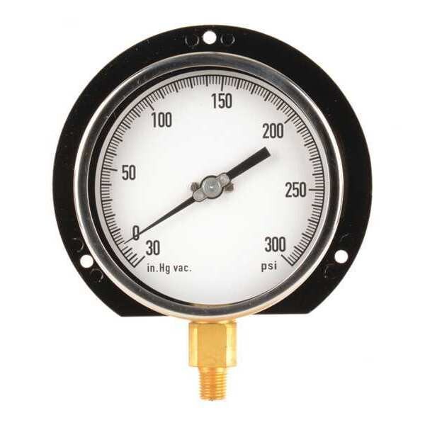 Process Compound Gauge, Nominal Dial Size 4 1/2 in, Accuracy +/-0.5 Percent, Gauge Case Material Cast Aluminum, Process Connection Type NPT, Process Connection Gender Male, Lens Material Glass, Process Connection Size 1/4 in, Field Fillable No, Process Connection Location Bottom, Case Color Black, IP/NEMA Rating Not Rated, Primary Pressure Range 30 to 0 to 300, Dry Dampening Feature None, Vibration Resistance None, Dial Color White, Pressure Gauge Type Process Pressure Gauge