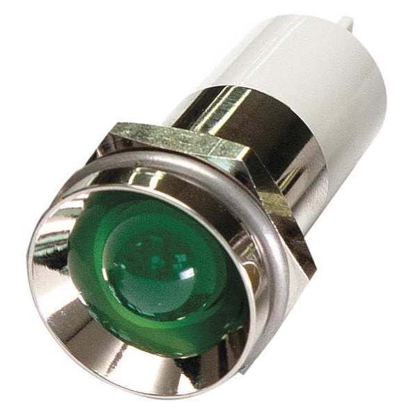 Protruding Panel Light, LED, Brass Plated Chrome, LED, Plastic (ABS), Green, Voltage 24V DC, Size 16mm Mounting dia, Electrical Connection 0.11 Male Quick Disconnect, Shape Round, Current Drawn 20 mA, Average Life 100,000 hr, IP Rating IP40, Panel Thickness Up to 0.160 in, Standards cRUus, RoHS