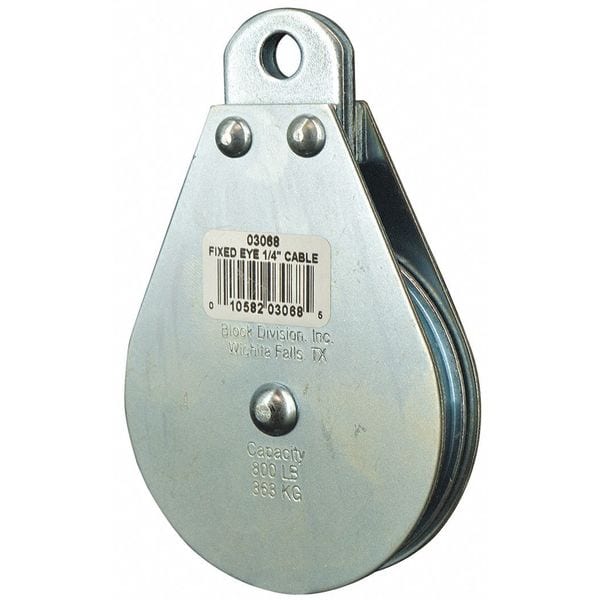 Pulley Block, Product Type Pulley Block, Pulley Type Fixed, Mount Type Upright Mount, Working Load Limit 800 lb, Operation Pulling, Attachment Type Fixed Eye, Compatible Rope Diameter 1/4 in, Sheave Inside Diameter 2 1/2 in, Sheave Depth 7/16 in, Sheave Outside Diameter 3 in, Compatible Rope Type Wire Rope, Bearing Type Sleeve, Attachment Inside Diameter 3/8 in, Housing Material Carbon Steel, Mounting Hole Diameter 3/8 in, Number of Grooves 1, Sheave Material Steel, Overall Height 4 7/8 in