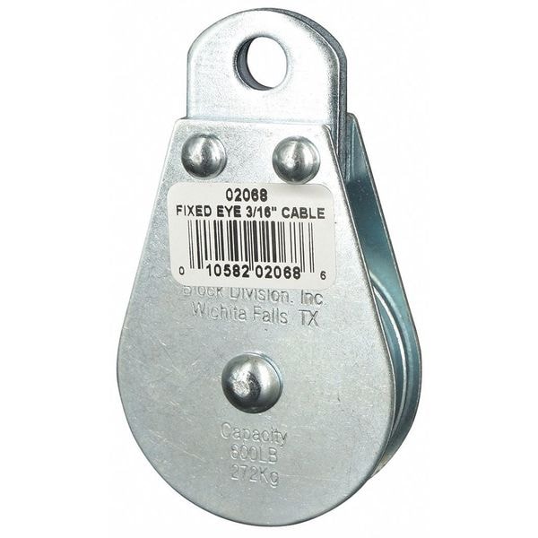 Pulley Block, Product Type Pulley Block, Pulley Type Fixed, Mount Type Upright Mount, Working Load Limit 600 lb, Operation Pulling, Attachment Type Fixed Eye, Compatible Rope Diameter 3/16 in, Sheave Inside Diameter 1 1/2 in, Sheave Depth 7/16 in, Sheave Outside Diameter 2 in, Compatible Rope Type Wire Rope, Bearing Type Sleeve, Attachment Inside Diameter 3/8 in, Housing Material Carbon Steel, Mounting Hole Diameter 3/8 in, Number of Grooves 1, Sheave Material Steel, Overall Height 3 3/4 in