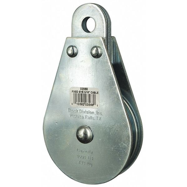 Pulley Block, Product Type Pulley Block, Pulley Type Fixed, Mount Type Upright Mount, Working Load Limit 1,550 lb, Operation Pulling, Attachment Type Fixed Eye, Compatible Rope Diameter 5/16 in, Sheave Inside Diameter 3 in, Sheave Depth 5/8 in, Sheave Outside Diameter 3 1/2 in, Compatible Rope Type Wire Rope, Bearing Type Sleeve, Attachment Inside Diameter 9/16 in, Housing Material Carbon Steel, Mounting Hole Diameter 9/16 in, Number of Grooves 1, Sheave Material Steel, Overall Height 6 1/2 in
