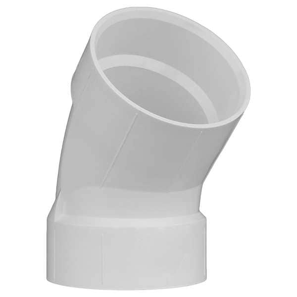 45 Degrees Elbow, PVC, Schedule 40, For Pipe Schedule Schedule 40, 4 in, Female, Socket, 5 in, 4 in, Female, Socket, 5 in, Includes Seal Seal Not Included, For Pipe Outside Diameter 4 1/2 in, 4 3/8 in Overall Length, Gravity Flow Maximum Operating Pressure, -20 Degrees to 140 Degrees F